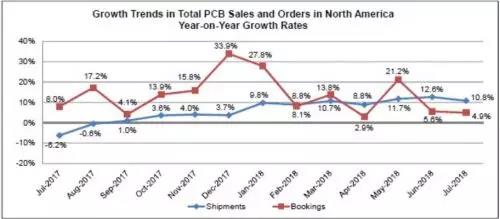 2018年7月份,PCB訂單量,與去年同期相比,增加了4.9%;年初至今的訂單量高于去年11.7%;與上個(gè)月相比,7月份的訂單量減少了12.3%。