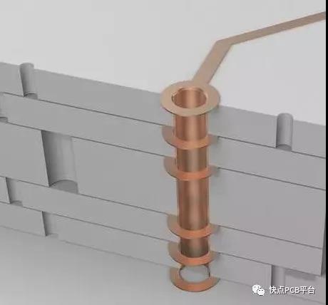 只有一種過孔,從第一層打到最后一層。不管是外部的線路還是內(nèi)部的線路,孔都是打穿的。叫做通孔板。通孔板和層數(shù)沒關(guān)系,平時大家用的2層的都是通孔板,而很多交換機和軍工電路板,做20層,還是通孔的。鉆頭把電路板鉆穿,然后在孔里鍍銅,形成通路。