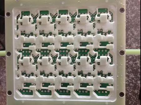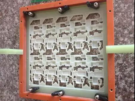 圖二的治具上面有一些孔和槽:孔是需要進(jìn)行后焊的位置,插件料的管腳可以從這些孔里面穿出來,把治具放到錫爐上面時(shí),只有這些孔的位置可以接觸到焊錫;槽對應(yīng)的是PCB貼片后各種元件,元件大的就挖大點(diǎn),元件小的就挖小點(diǎn),這樣貼好貼片元件的PCB板就可以平整的放在治具上面。