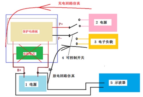 在充電時,電流從P+,P- 流向B+,B-; 而放電時,電流又從B+,B-流向 P+,P-。所以,測試保護(hù)板的充電性能時,P+,P-端需要一臺電源,而B+,B-端需要一臺負(fù)載(通常,還需要一臺電源激活保護(hù)電路);而放電測試時則相反,B+,B-端要用電源,P+,P-端需要電子負(fù)載。另外,測試保護(hù)電路的響應(yīng)時間還需要使用示波器;保護(hù)板的待機(jī)空耗(uA級電流)還需要使用數(shù)字萬用表;保護(hù)板的串聯(lián)電阻還需要電源和數(shù)字萬用表(測量P+ ->B+, P- ->B-的電阻)。