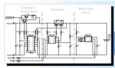一個典型的鋰離子電池綜合保護(hù)電路,從左至右分別為電量計電路/保護(hù)電路/實時時鐘.