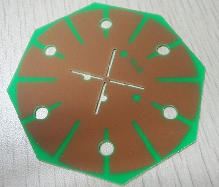 單面板的布線圖以網(wǎng)路印刷(Screen Printing)為主,亦即在銅表面印上阻劑,經(jīng)蝕刻后再以防焊阻印上記號(hào),最后再以沖孔加工方式完成零件導(dǎo)孔及外形。此外,部份少量多樣生產(chǎn)的產(chǎn)品,則采用感光阻劑形成圖樣的照相法。