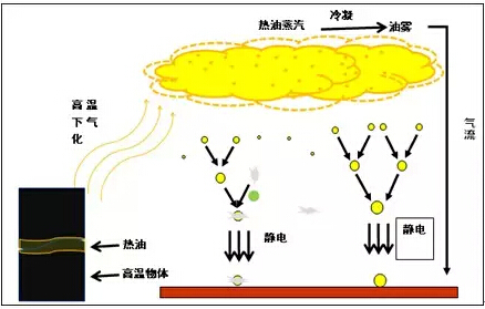 通常液霧的噴射霧化過程分為三個階段:一是液體在噴嘴內部流動階段;二是液體噴出后由液柱分裂為霧滴的階段;三是霧滴在氣體中進一步破碎階段[1]。導熱油受熱后體積膨脹顯著,當層壓機導熱油管道有輕微滲漏時,由于溫度的作用,導熱油膨脹,致使導熱油會從滲漏口滲出,此緩慢的瀉出過程,可以比喻成一個噴嘴噴射的過程。也就是導熱油從滲漏口滲出后,形成了霧化狀態(tài)。液體霧化的物理本質是:在外加能量的作用下,先將燃料油擴展成很薄的液膜或很細的射流,然后利用各種擾動,或在運動中由于動力的作用,使液膜或射流失穩(wěn),進而碎裂成絲條和大的液滴,最后破碎成小液滴[2]。霧化形成的小油滴,在層壓機和分發(fā)區(qū)域回流氣流的作用下,霧化的油霧會滲透到層壓機和分發(fā)區(qū)域的各個角落。由于霧化的油霧表面會帶一些電荷,通過自由落體和異性相吸的作用,霧化的油霧會粘度在覆銅板表面,進而形成覆銅板表面的油點缺陷。我們可以通過一個模型圖對覆銅板表面油點缺陷形成機理和形成過程進行描述,具體見下圖。