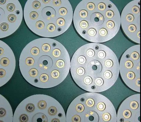 分別是電路層(銅箔)、絕緣層和金屬基層。常見于LED照明產(chǎn)品。有正反兩面,白色的一面是焊接LED引腳的,另一面呈現(xiàn)鋁本色,一般會(huì)涂抹導(dǎo)熱凝漿后與導(dǎo)熱部分接觸。目前還有陶瓷基板等等。如圖: