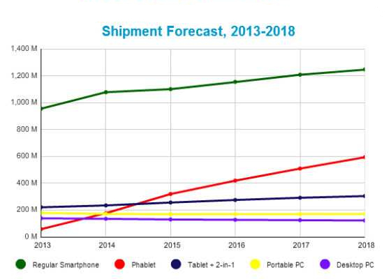 IDC項(xiàng)目研究經(jīng)理 Melissa Chau表示:“隨著蘋果公司在未來(lái)幾周內(nèi)加入這一陣營(yíng),大屏成為手機(jī)標(biāo)配,我們預(yù)計(jì)平板手機(jī)市場(chǎng)將獲得更高的關(guān)注度。”。IDC預(yù)測(cè)在2014年,在全球智能手機(jī)的市場(chǎng)中,平板手機(jī)的銷售份額將增長(zhǎng)14%;而在2018年,這個(gè)數(shù)字更將增長(zhǎng)至32.2%。