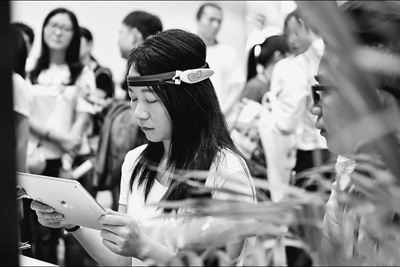 圖一為拼版照片,其中上圖是來高交會參觀的外籍觀眾;左中、左下、右下圖是在高交會上拍攝的各類VR游戲。圖二為一名觀眾體驗智能頭帶。這款智能頭帶可以感受使用者腦電波,通過采集注意力放松和集中時不同的腦電波驅動游戲。