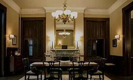 第一季的開始,弗蘭克在他家的別墅前親手結(jié)束了一只躺在路上奄奄一息的狗的生命,他說“世上有兩種痛苦,一種令你強(qiáng)壯,另一種毫無用處。我沒耐心浪費(fèi)在無用的東西上。”整部劇由此句話拉開序幕,令人印象深刻的還有弗蘭克背后的經(jīng)典聯(lián)排別墅。這就是弗蘭克和克萊爾·安德伍德的家,外景實(shí)際上位于巴爾的摩,家的內(nèi)部則全部在舞臺上搭建而成。別墅中,維多利亞式內(nèi)飾、高大的天花板、傳統(tǒng)燈具、帶有木質(zhì)百葉的窗戶、口袋門,營造出一個(gè)極具深度的房子,里面的一切決定了不是所有的人都可以看得到室內(nèi)。