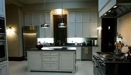 當(dāng)飾演弗蘭克和克萊爾·安德伍德夫婦的凱文·史派西和羅賓·懷特在拍攝時(shí)看到他們在劇中的家時(shí),提出的一個(gè)共同的想法是“應(yīng)當(dāng)有一處設(shè)計(jì)和現(xiàn)代感發(fā)生觸碰”。紙牌屋制作設(shè)計(jì)師SteveArnold讓現(xiàn)代口味首先在廚房里發(fā)生:法國經(jīng)典的Tolix金屬椅,工業(yè)風(fēng)濃厚的金屬吊燈和時(shí)尚電器,再結(jié)合骨白色的地磚,整個(gè)廚房堪稱完美。此外設(shè)計(jì)團(tuán)隊(duì)在采納這個(gè)意見的同時(shí),也因?yàn)榭巳R爾對攝影的興趣在家里擺放了很多當(dāng)代藝術(shù)作品。