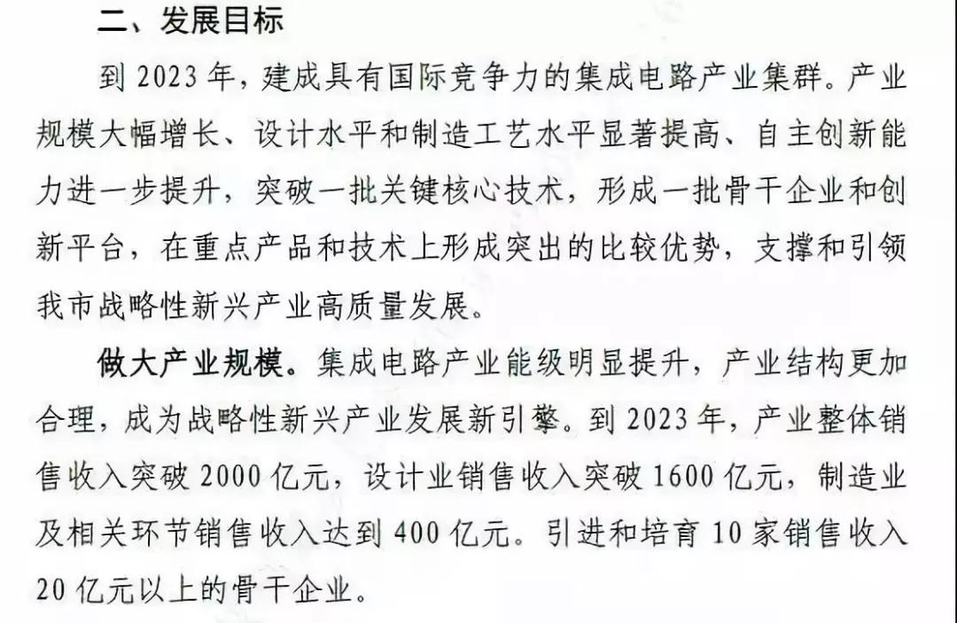 到2023 年,產(chǎn)業(yè)整體銷售收入突破2000 億元,設(shè)計(jì)業(yè)銷售收入突破1600 億元,制造業(yè)及相關(guān)環(huán)節(jié)銷售收入達(dá)到400億元,引進(jìn)和培育10 家銷售收入20億元以上的骨干企業(yè),成為戰(zhàn)略性新興產(chǎn)業(yè)發(fā)展新引擎。