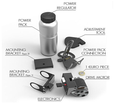 add-E系統(tǒng)包括把一個普通自行車變成電動自行車所需的所有組件。該設備體積和重量足夠小,以減輕對自行車的載重負荷,它可以放在任何現(xiàn)有的自行車上。add-E系統(tǒng)的電源包看起來像一個水瓶,并適合放置于普通自行車水壺架。