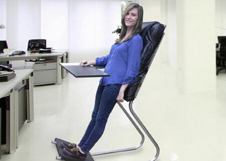 正因?yàn)樗哂幸欢ǖ膬A斜度,所以使用者的身體腿部、腳部重量將會(huì)轉(zhuǎn)移到椅子上。LeanChair椅子底部有一個(gè)鋼架,支持著雙腿,腳底是一個(gè)踏板,雙腳可以踩在上面,大概在人體腰部位置,安裝著一個(gè)支撐臺(tái),可以放鼠標(biāo)和鍵盤。這款倚靠式站椅實(shí)際等同于辦公室放著到的老板椅,可以讓你的雙腳離地,只不過(guò)向后傾斜的程度并沒(méi)有那么大。