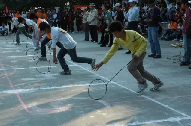 用鐵絲做一個(gè)圈,然后再做一個(gè)長(zhǎng)柄的鐵鉤子,推著這個(gè)鐵絲圈滾著走。鐵鉤子也可以換成一根竹棍或別的,只要能推著鐵圈滾就行。