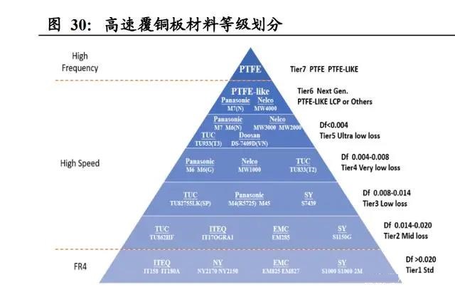 PCB廠的技術(shù)升級要求同步降低Df值,倒逼CCL高速化。高速CCL材料按低介電損耗從大到小可以分為STD Loss、Mid Loss、Low Loss、Very Low Loss、Ultra Low Loss以及高頻七個等級。由于兩節(jié)點之間的傳輸損耗與傳輸頻率和單位距離傳輸損耗正向相關(guān),當傳輸速率提高時,傳輸頻率同步提高。為降低兩節(jié)點間的傳輸損耗,保證信號的完整性,則需降低由低介電損耗決定的位距離傳輸損耗。因此高傳輸速率倒逼CCL高速化,Pcle 3.0采用Mid Low級別CCL,對應Df值在0.014~0.02之間;Pcle 4.0則需要Df值在 0.008~0.014之間的Low Loss級別CCL材料;未來PCIe5.0將采用Very Low Loss及以上級別的材料,彼時Df值需低于0.008。