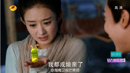 異朽閣閣主用天水滴沾了小骨的血,小骨將它掛在脖子上,但是半路上發(fā)現(xiàn)它裂開縫隙,出現(xiàn)了一條以她精血為食的靈蟲,上圖這個(gè)肥嘟嘟綠色的小蟲子便是糖寶。只是這么可愛的萌寵卻是花五毛錢特效做出來(lái)的,也就是說(shuō),小骨這一臉的表情是對(duì)著空氣做的,后續(xù)一系列與糖寶的互動(dòng)也是隔空演出的。小編忍不住想說(shuō),小骨可以去出版表情包啦。