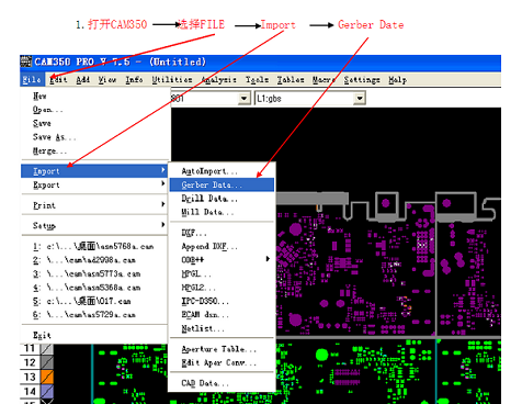 2、打開線路板廠使用的CAM輔助軟件CAM350,選擇File->Import-Gerber date