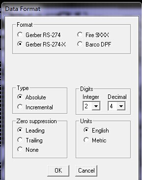 7、如果線路板資料導(dǎo)入進(jìn)去看到的圖形不正確,則需要更改格式,更改type,zero suppression、digits、units.