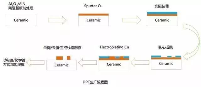 在薄膜工藝中,基于薄膜電路工藝,通過(guò)磁控濺射實(shí)現(xiàn)陶瓷表面金屬化,通過(guò)電鍍實(shí)現(xiàn)銅層和金成的厚度大于10微米以上。即 DPC( Direct Plate Copper-直接鍍銅基板)。