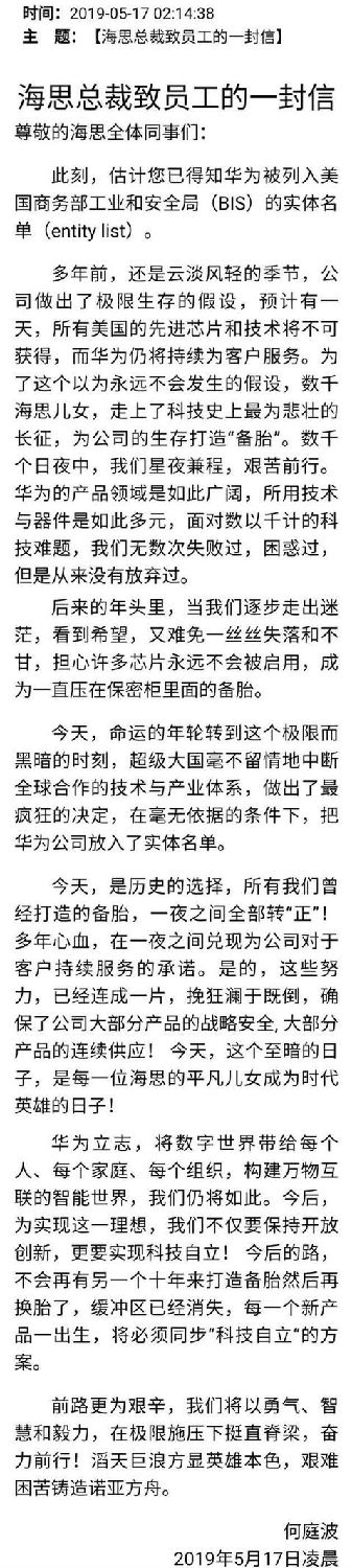 另一封更引線路板小編矚目的信,來自5月17日凌晨華為海思(華為下屬的海思半導(dǎo)體公司即華為自己的芯片企業(yè))總裁致員工的一封信。