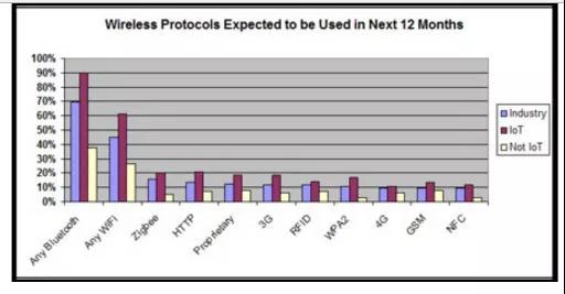 上圖表示開發(fā)者對(duì)采用無(wú)線協(xié)議的預(yù)期,紅色表示物聯(lián)網(wǎng)