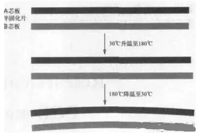 不同CTE芯板壓合過(guò)程中變形示意