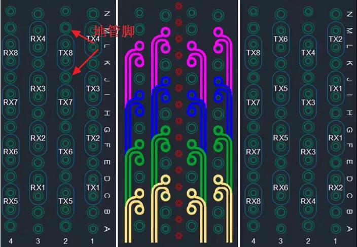 包括一些高速連接器在設(shè)計(jì)的時(shí)候其高速信號(hào)管腳兩邊也是地管腳如下圖所示。