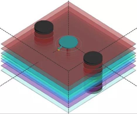 回流地孔不僅能改善信號(hào)的EMC和回流通道,還能改善過孔的阻抗,降低鏈路阻抗的不連續(xù)性。高速差分過孔三維電磁仿真的過孔模型,其中就包含了回流地孔,如下圖所示。