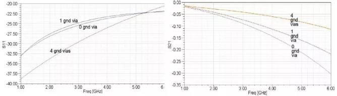 接地過孔的數(shù)量是不是越多越好呢?在一定頻率的信號(hào)傳輸通路,幾個(gè)接地過孔就足夠了呢?為了弄清楚這些問題,需要對(duì)接地過孔的數(shù)量進(jìn)行仿真,仿真結(jié)果如下圖所示。