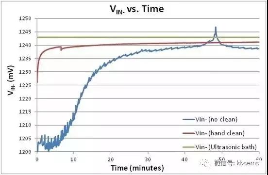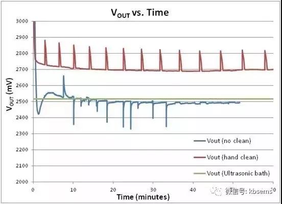 從圖 3 中可以看出,焊劑污染對(duì)橋接傳感器輸出性能有嚴(yán)重的影響。在未清潔或手工清洗的情況下,橋接傳感器電壓從未達(dá)到約 VREF/2 的預(yù)期電壓,即便在一小時(shí)趨穩(wěn)時(shí)間之后。此外,未清潔電路板還表現(xiàn)出大量外部噪聲收集。在使用超聲波浴清洗并完全干燥后,橋接傳感器電壓穩(wěn)如磐石。