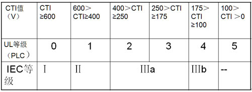相比漏電起痕指數(shù)Comparative Tracking Index (CTI):材料表面能經(jīng)受住50滴電解液(0.1%氯化銨水溶液)而沒有形成漏電痕跡的最高電壓值,單位為V。