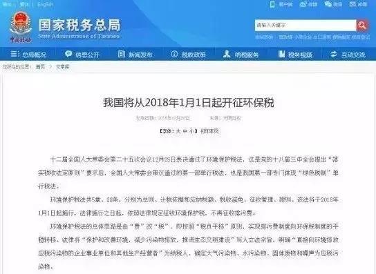 《中華人民共和國(guó)環(huán)境保護(hù)稅法》將于2018年1月1日起正式實(shí)施。環(huán)保稅法列出了環(huán)保稅征稅稅目及稅額,也明確大氣和水污染物的稅額由省級(jí)政府確定,報(bào)經(jīng)省級(jí)人大常委會(huì)決定。