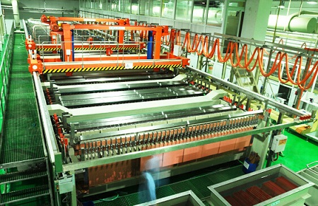 對(duì)于槽寬大于1.6m的鍍槽,應(yīng)考慮采用雙邊進(jìn)電的方式,并且雙邊電纜的長度應(yīng)相等。這樣,才能保證雙邊電流誤差控制在一定范圍內(nèi)。鍍槽的每根飛巴的兩面應(yīng)各連接一臺(tái)整流器,這樣可以對(duì)件的兩個(gè)面的電流分別予以調(diào)整。