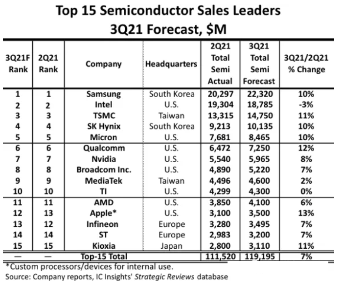 總體而言,前 15 家公司預(yù)計(jì)將在 21 年第三季度實(shí)現(xiàn) 7% 的增長。半導(dǎo)體銷售預(yù)計(jì)到年底仍將保持強(qiáng)勁,這支持 IC Insights 目前對(duì)今年全球半導(dǎo)體銷售增長 24% 的預(yù)測(cè)。