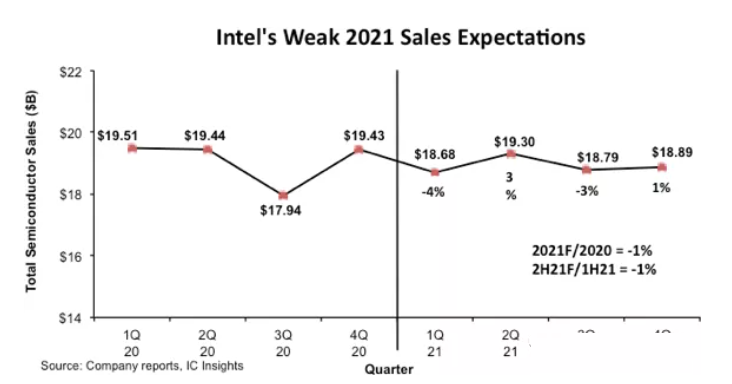 據(jù)汽車電路板廠了解,一些領(lǐng)先的公司——尤其是英特爾和德州儀器——預(yù)計(jì) 21 年第三季度的銷售額不會(huì)出現(xiàn)如此樂觀的增長。TI 指導(dǎo) 21 年第三季度銷售業(yè)績持平。英特爾現(xiàn)在是全球第二大半導(dǎo)體供應(yīng)商,在其最近的收益報(bào)告中將其 21 年第三季度的銷售指導(dǎo)定為 -3%,并將全年銷售指導(dǎo)定為 -1%(圖 2)。在預(yù)計(jì)半導(dǎo)體總銷售額將增長 24% 的一年中,這對(duì)于這家處理器巨頭來說將是一個(gè)特別疲軟的表現(xiàn)。此外,英特爾的 2H21/1H21 銷售預(yù)期也下降 1%。目前預(yù)計(jì)英特爾 2021 年第 4 季度的銷售額將比其 20 年第 1 季度的銷售額低 3%,從而導(dǎo)致兩年期間業(yè)績基本持平。