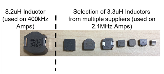 一個400kHz的汽車音頻放大器通常使用10μH或8.2μH的電感值,而2.1MHz的高開關(guān)頻率放大器設(shè)計可以利用體積更小、重量更輕的3.3μH—3.6μH范圍的電感器(假設(shè)每個放大器提供相等的輸出功率)。