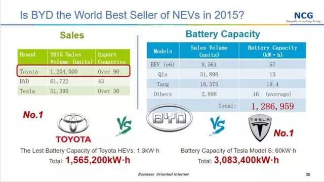 仔細(xì)分析原因,用銷量對比,2015年豐田混合動(dòng)力汽車是全球第一,超過120萬,銷往90余個(gè)國家。豐田汽車的前5大市場分別是中國、美國、巴西、英國和加拿大,其中并沒有日本。比亞迪銷量排名第二,超過6萬輛,雖然資料顯示銷往43個(gè)國家,但是2015年年報(bào)顯示,比亞迪的海外收入不到總收入的5%。