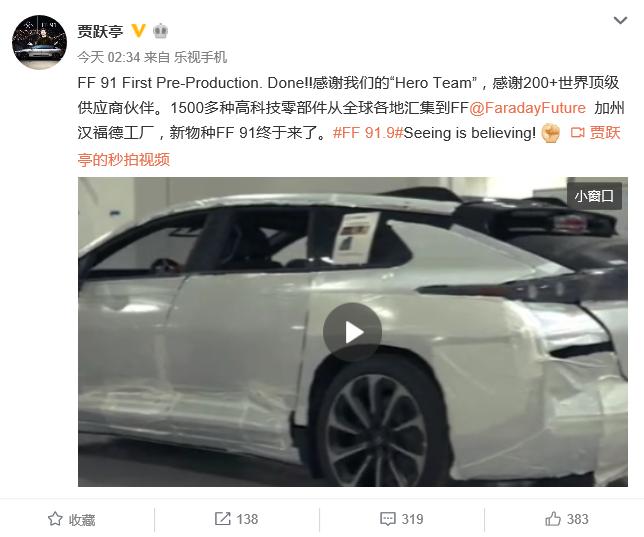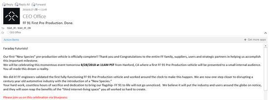 28日據(jù)CNET報(bào)道,一封流出的法拉第未來(lái)CEO辦公室郵件顯示,周一成功試產(chǎn)了第一輛全功能的FF91電動(dòng)SUV,他們?cè)谟?jì)劃的時(shí)間之內(nèi)做到了這一點(diǎn)。FF公司定于當(dāng)?shù)貢r(shí)間828日上午11點(diǎn)在加州的漢福德工廠舉行慶?;顒?dòng),不過(guò)僅有少量人可以出席。CEO賈躍亭在信中表示,FF91將為用戶打造第三個(gè)互聯(lián)網(wǎng)生活空間。