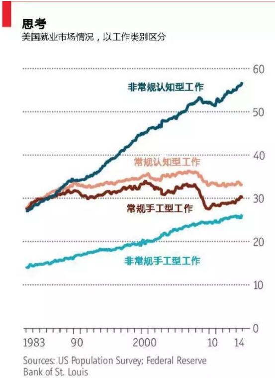 未來,大量的流水線工作會逐漸被人工智能所替代。根據(jù)研究,美國大約有47%的工作面臨來自于機器人的競爭壓力。事實上,過去20年美國收入中位數(shù)是下降的,已經(jīng)反映了部分機器代替?zhèn)鹘y(tǒng)“技工”的情況。