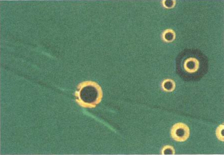 另外,膠片(PP)組合方式和熱壓參數(shù)也非常重要。如果膠片疊合移動或產(chǎn)生流膠不當(dāng),銅皮飄移在融熔樹脂表而必然會產(chǎn)生縐折。要防止這類問題發(fā)生,壓板用的載盤就是作業(yè)重點(diǎn)。目前業(yè)者使用的載盤設(shè)計(jì),多數(shù)都已經(jīng)采用彈性高度調(diào)控的擋滑設(shè)計(jì),這種設(shè)計(jì)可以在壓板過程中完整防止鋼板偏滑,因而導(dǎo)致的縐折就不會發(fā)生。