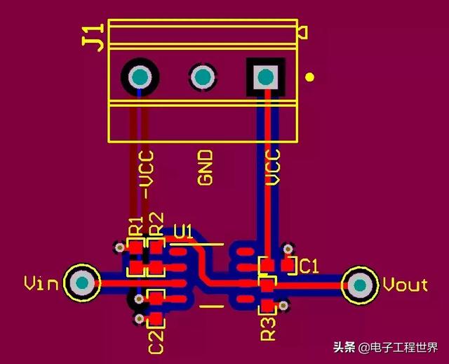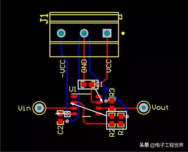 我指派實(shí)習(xí)生為該設(shè)計(jì)布設(shè)電路板,同時(shí)為他做了PCB布設(shè)方面的一般指導(dǎo)(即盡可能縮短電路板的走線路徑,同時(shí)將組件保持緊密排布,以減小電路板空間),然后讓他自行設(shè)計(jì)。設(shè)計(jì)過(guò)程到底有多難?其實(shí)就是幾個(gè)電阻器和電容器罷了,不是嗎?圖2所示為他首次嘗試設(shè)計(jì)的布局。紅線為電路板頂層的路徑,而藍(lán)線為底層的路徑。