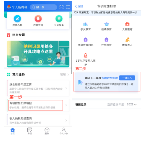 打開個(gè)人所得稅APP首頁,選擇專項(xiàng)附加扣除填報(bào),選擇一鍵帶入。如下圖: