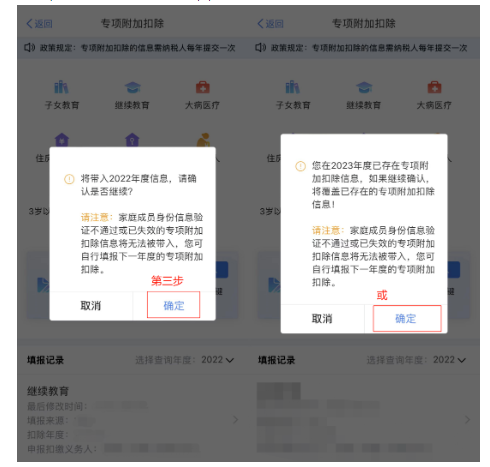 ②依據(jù)提示“將帶入2022年度信息,請確認(rèn)是否繼續(xù)?”或者“您在2023年已存在專項(xiàng)附加扣除信息,如果繼續(xù)確認(rèn),將覆蓋已存在的專項(xiàng)附加扣除信息!”,確認(rèn)后點(diǎn)擊確定。如下圖: