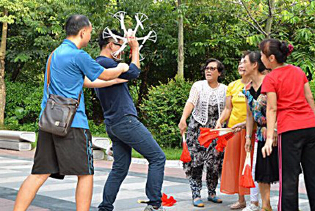 小伙發(fā)現(xiàn)遭到“劫機”事件,趕緊跑來找大媽們賠償,卻不料大媽不僅否認(rèn)擊落了無人機,更表示自己險些被無人機砸傷。小伙欲哭無淚:“為了給女朋友制造驚喜,特意買的月餅券竟然全被大媽們搶走了,真是賠了夫人又折兵!”周圍也有不少圍觀群眾前來勸解:“90后遇上彪悍大媽,果然是秀才遇到兵,有理說不清!”