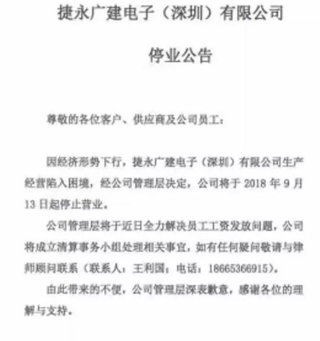 913日,捷永廣建電子(深圳)有限公司發(fā)布的停業(yè)公告