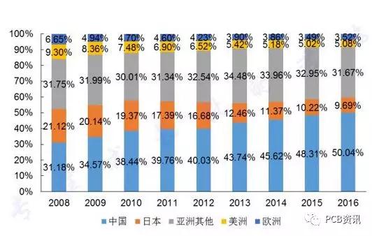 此消彼長,歐美日的PCB市場份額不斷走低,大陸的PCB產(chǎn)值從2008年的150.4億美元增長至2017年的280.9億美元,占全球的比重高達(dá)50.82%,年均復(fù)合增長率為7.2%。