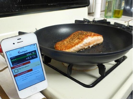 它的名字叫Pantelligent,配備了一個中央溫度表,鍋把部分還內(nèi)置了藍牙模塊,可與手機中的配套應(yīng)用程序相連。它會提醒你,什么時間可以倒油了,什么時間可以加配料了、什么時間食物已經(jīng)到了幾成熟了。