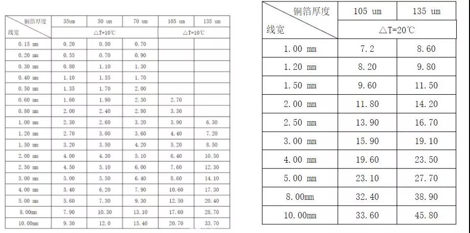 從表中可以大約知道1OZ銅厚的電路板,在10溫升時,100mil (2.5mm) 寬度的導線能夠通過4.5A的電流。并且隨著寬度的增加,汽車無線充PCB載流能力并不是嚴格按照線性增加,而是增加幅度慢慢減小,這也是和實際工程里的情況一致。如果提高溫升,導線的載流能力也能夠得到提高。