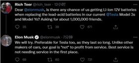在問到特斯拉CEO馬斯克能否在旗下車型中加入鋰離子電池等續(xù)航能力更佳的可替換電池,馬斯克則表示正在考慮。此外,他還強(qiáng)調(diào)了特斯拉的目標(biāo)是 " 服務(wù)免費(fèi) ",似乎表達(dá)了為用戶盡心提升體驗(yàn)升級(jí)的意思。