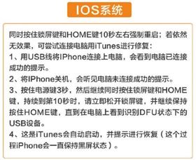 同時按住鎖屏鍵和HOME鍵10秒左右強制重啟。若依然無效,可嘗試與電腦連接,用iTunes進行手機修復。具體操作步驟如下: