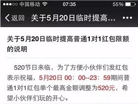 微信紅包也破了例,普通1對(duì)1紅包單個(gè)最高金額調(diào)整為520元。見證感情的時(shí)刻到了,別說微信沒給你機(jī)會(huì)。