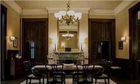 第一季的開(kāi)始,弗蘭克在他家的別墅前親手結(jié)束了一只躺在路上奄奄一息的狗的生命,他說(shuō)“世上有兩種痛苦,一種令你強(qiáng)壯,另一種毫無(wú)用處。我沒(méi)耐心浪費(fèi)在無(wú)用的東西上。”整部劇由此句話拉開(kāi)序幕,令人印象深刻的還有弗蘭克背后的經(jīng)典聯(lián)排別墅。這就是弗蘭克和克萊爾·安德伍德的家,外景實(shí)際上位于巴爾的摩,家的內(nèi)部則全部在舞臺(tái)上搭建而成。別墅中,維多利亞式內(nèi)飾、高大的天花板、傳統(tǒng)燈具、帶有木質(zhì)百葉的窗戶、口袋門(mén),營(yíng)造出一個(gè)極具深度的房子,里面的一切決定了不是所有的人都可以看得到室內(nèi)。